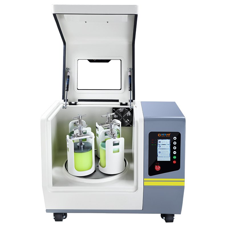 行星球磨机早先只有立式款,而后出现了卧式款,因卧式的装料过程中存在着众多不方便等缺陷,我公司又研发了既能立式研磨,又装料方便的卧式款,总称为全方位行星式球磨机全方位行星球磨机是基于立式行星球磨机基础上优化并升级的一款球磨机,立式行星球磨机做湿磨或者粉体较为容易研磨,但是部分材料进入亚微米及微米状态时较为容易沉淀在底部,全方位行星球磨机解决了目前这个问题,全方位行星球磨机可在行星主盘公转状态下做自转,且行星主盘又做360°旋转,可直接将罐体内底部的粉体翻倒过来研磨,且在研磨过程中粉体不存在沉淀在底部。在粉体实验过程中,因行星球磨的能量较高,罐体内的温度散热较慢,温度将不断上升并聚集在罐体内,受罐内的高温影响粉体将会出现冷焊,溶解等一系列的原因导致粉体粘壁,结块,氧化,因此我公司又在全方位行星球磨机的基础上研发生产了一款空调循环冷风全方位行星球磨机,这一款产品的诞生直接解决了原有的行星球磨机粉体沉淀,高温影响粉体成型,氧化等一系列问题。